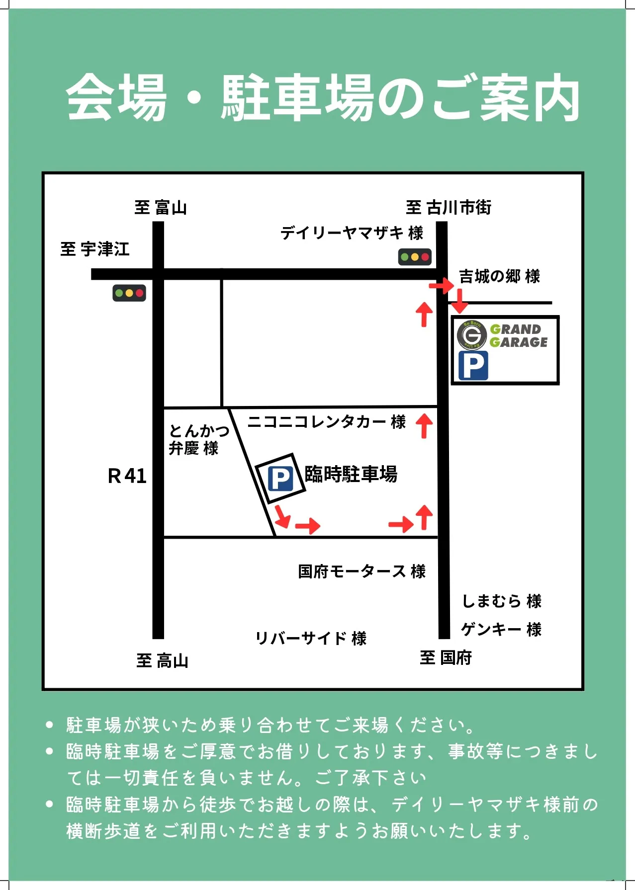 当日は駐車場が狭いため、乗り合わせてご来場くださいませ。